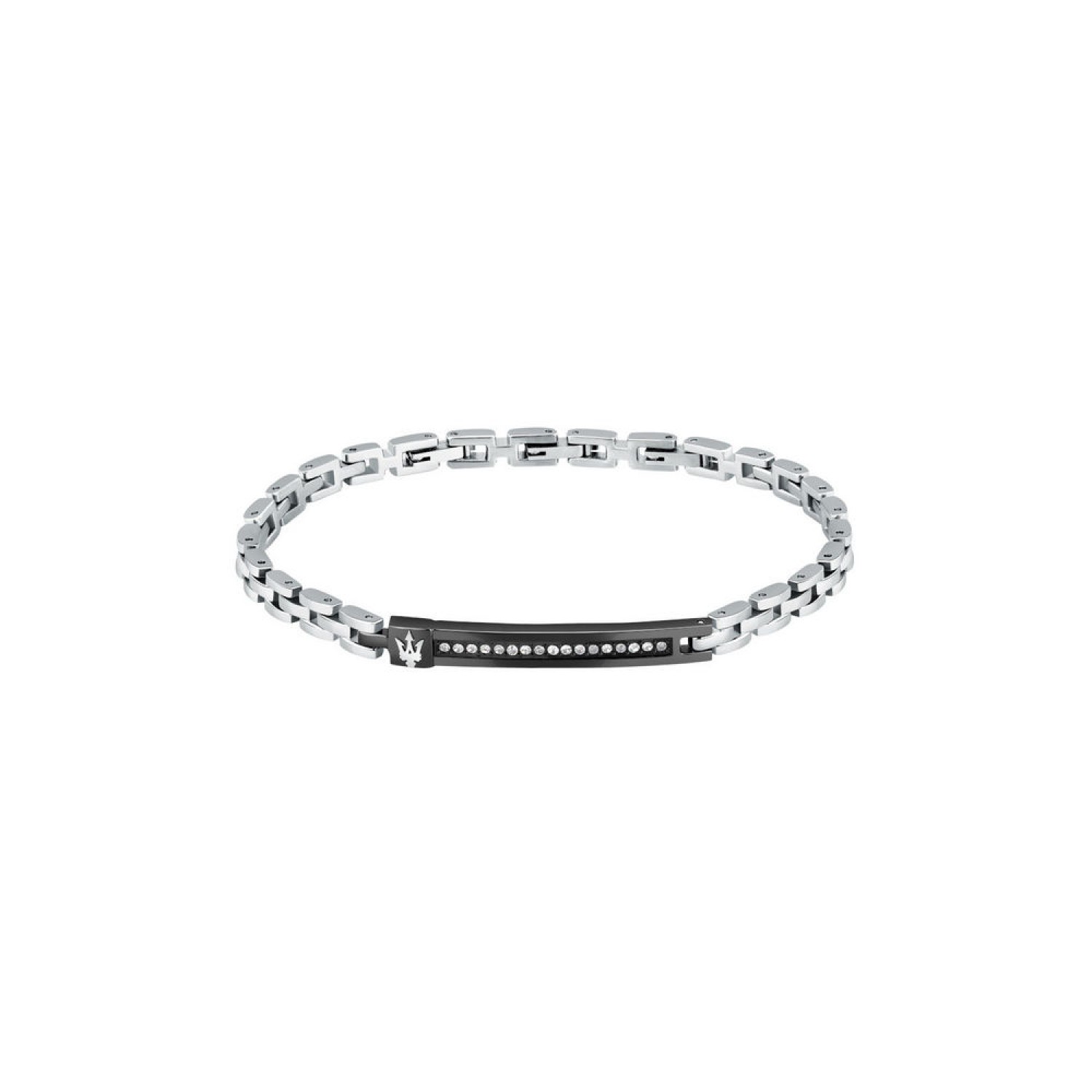 Ανδρικό βραχιόλι MASERATI από ανοξείδωτο ατσάλι. To βραχιόλι είναι ασημένιου και μαύρου χρώματος, με πέτρες και λογότυπο της εταιρείας(18+3,5cm).
