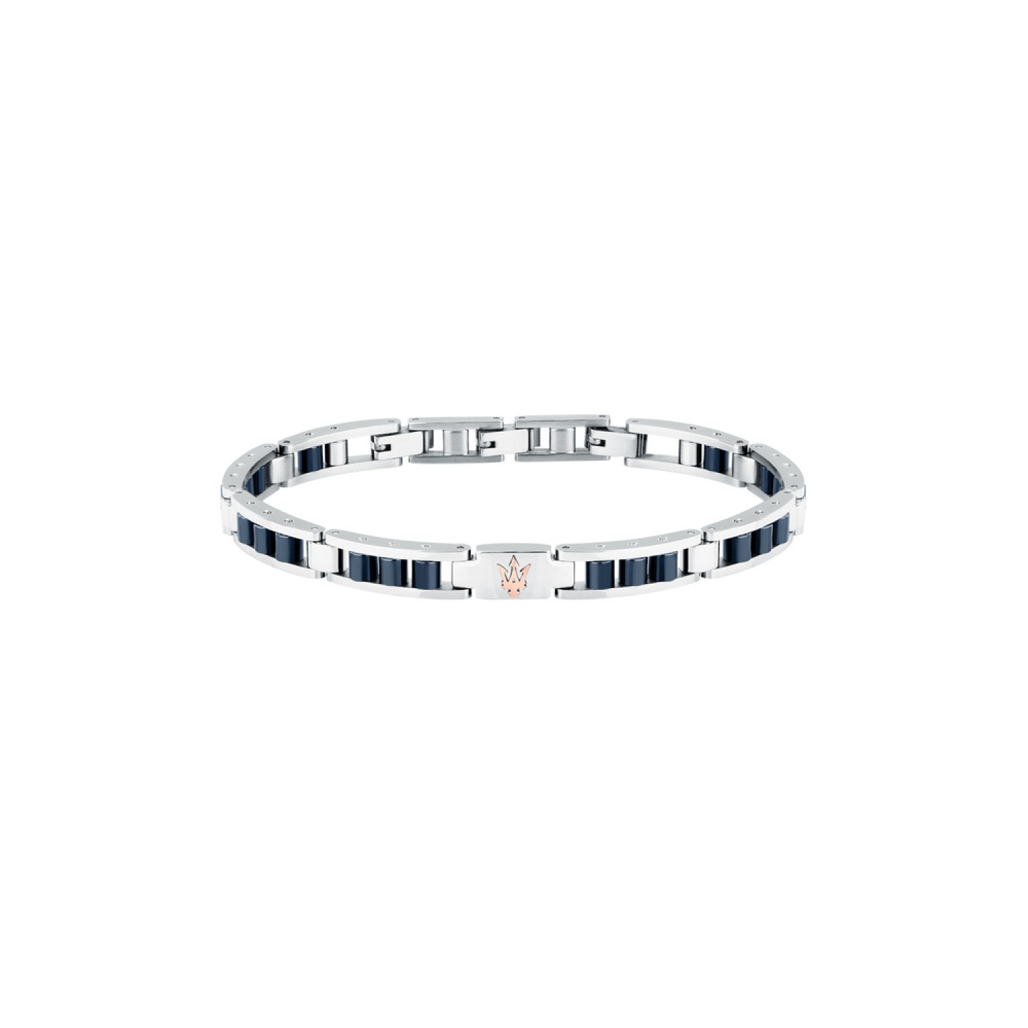 Ανδρικό βραχιόλι MASERATI CERAMIC JM225ATZ58 από ανοξείδωτο ατσάλι με κεραμικά στοιχεία, μπλε και ασημένιου χρώματος με ροζ χρυσή τρίαινα και λογότυπο.
