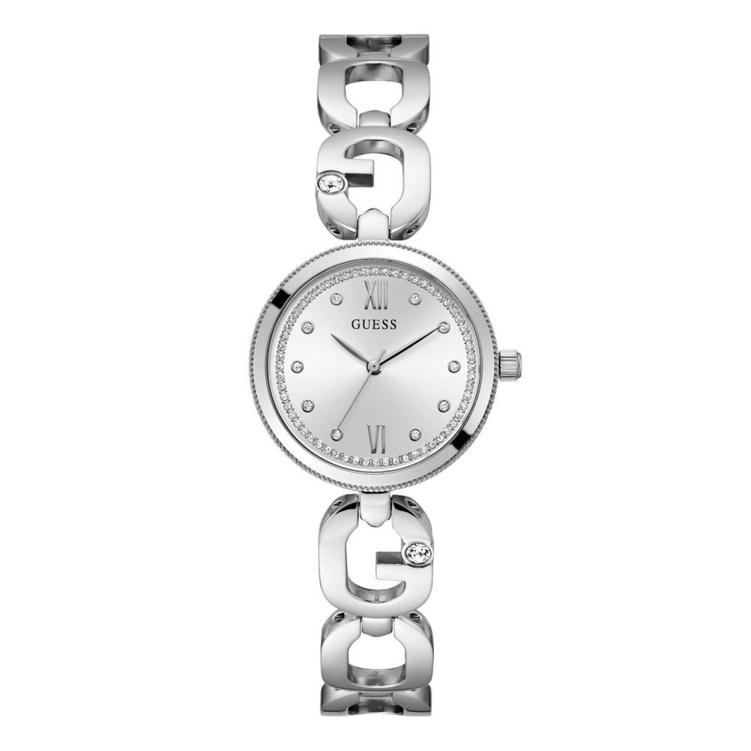 Γυναικείο ρολόι διαμέτρου 30mm με μηχανισμό QUARTZ ακριβείας. Έχει ασημένιο καντράν με διαφανείς πέτρες ζιργκόν και ασημί δείκτες. Η κάσα του είναι από ανακυκλωμένο ατσάλι με ασημένιες λεπτομέρειες.Έχει ασημένιο μπρασελέ και κούμπωμα G-LING. Είναι αδιάβροχο (3 ΑΤΜ). Συνοδεύεται από κουτί συσκευασίας GUESS και ΕΓΓΥΗΣΗ 2 ΕΤΩΝ της επίσημης αντιπροσωπείας GUESS.