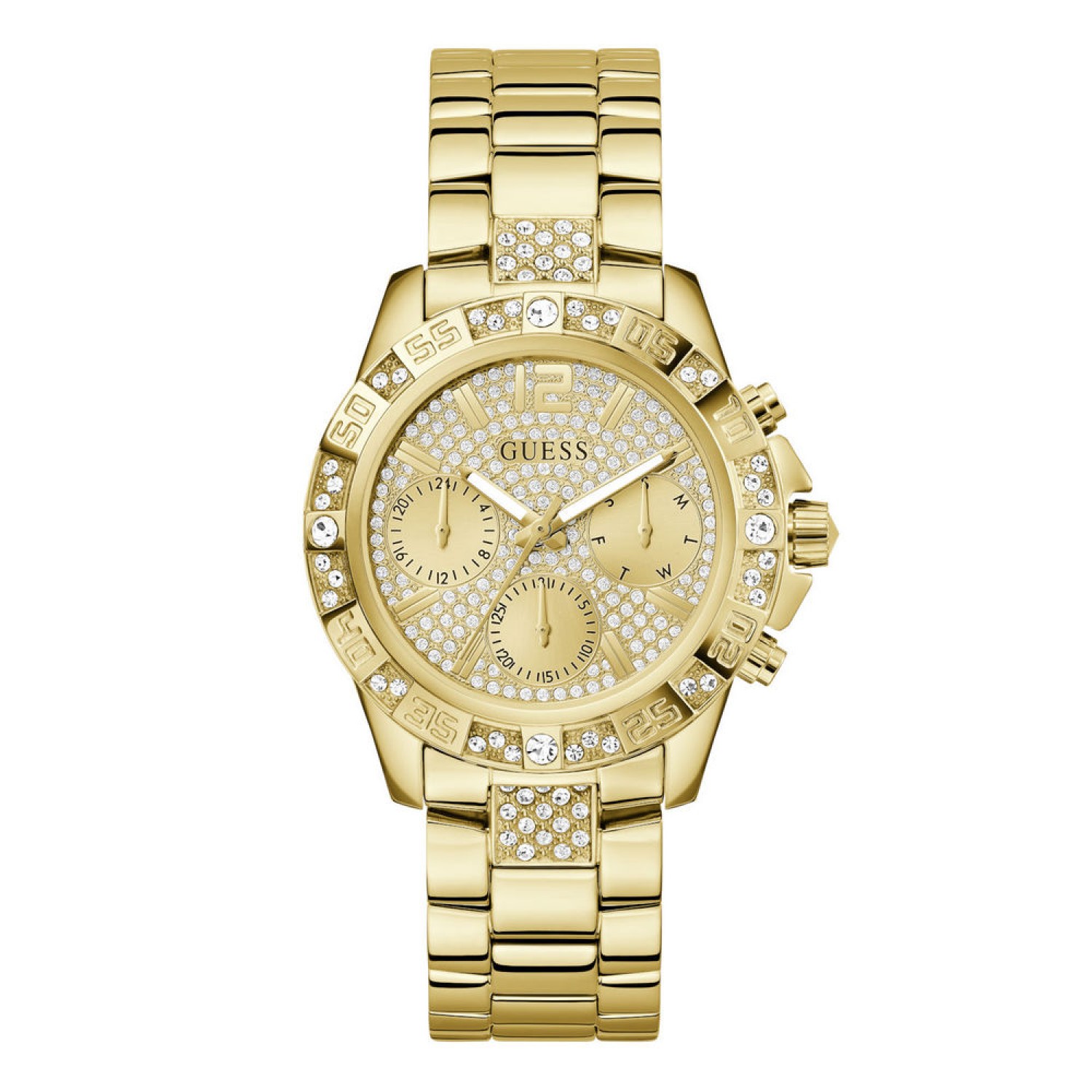 Γυναικείο ρολόι διαμέτρου 40mm με μηχανισμό Quartz multifuction ακριβείας. Έχει χρυσό καντράν με χρυσούς δείκτες και διαφανείς πέτρες ζιργκόν. Η κάσα του είναι από ανακυκλωμένο ατσάλι με χρυσές λεπτομέρειες.Έχει χρυσό μπρασελέ και κούμπωμα ασφαλείας. Είναι αδιάβροχο (5 ΑΤΜ). Συνοδεύεται από κουτί συσκευασίας GUESS και ΕΓΓΥΗΣΗ 2 ΕΤΩΝ της επίσημης αντιπροσωπείας GUESS.