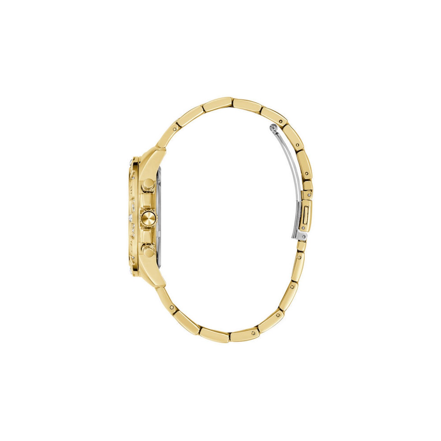 Γυναικείο ρολόι GUESS MAJESTY GW0771L2 διαμέτρου 40mm, με μηχανισμό Quartz multifuction ακριβείας, χρυσό καντράν και μπρασελέ από ανακυκλωμένο ατσάλι.