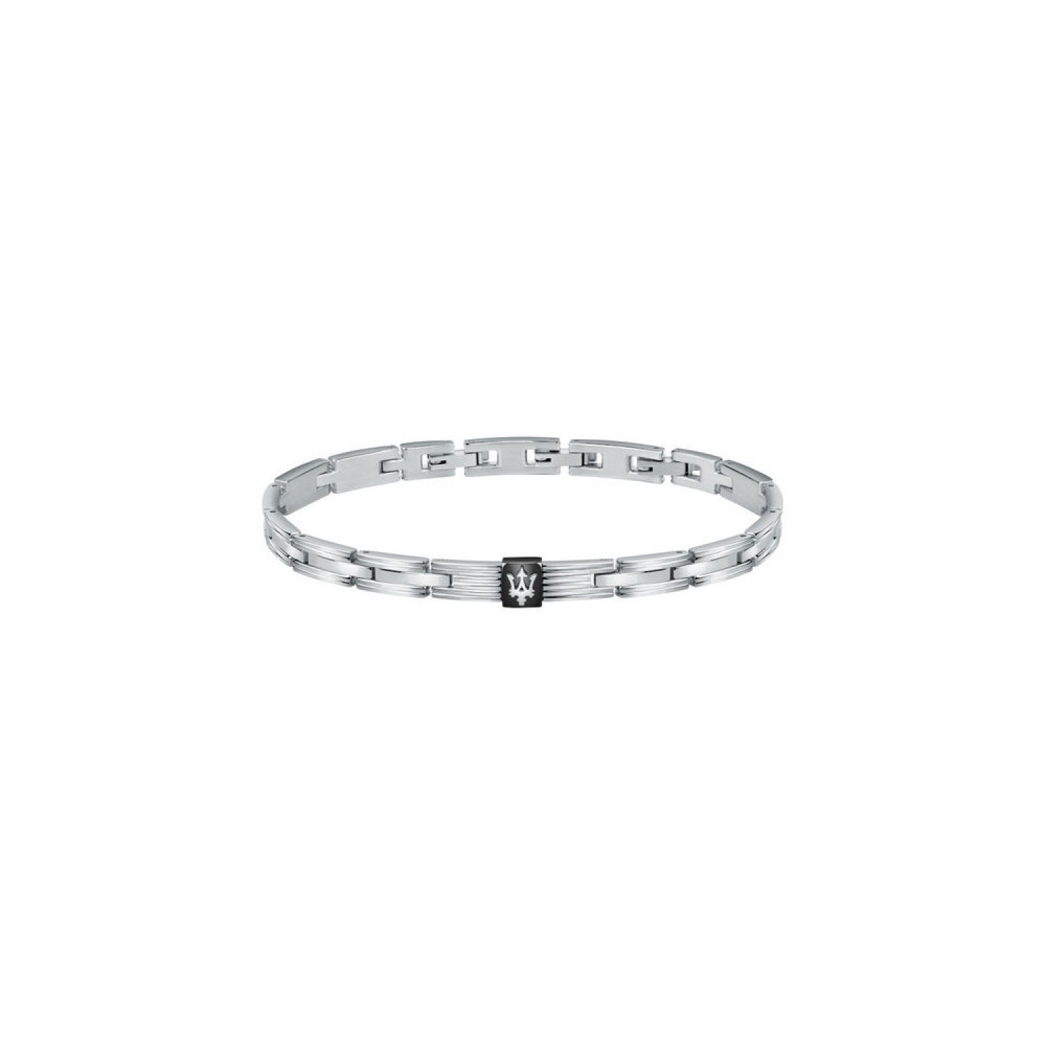 Ανδρικό βραχιόλι MASERATI από ανοξείδωτο ατσάλι. To βραχιόλι είναι ασημένιου με λεπτομέρειες μαύρου χρώματος και έχει το λογότυπο της εταιρείας(22cm).
